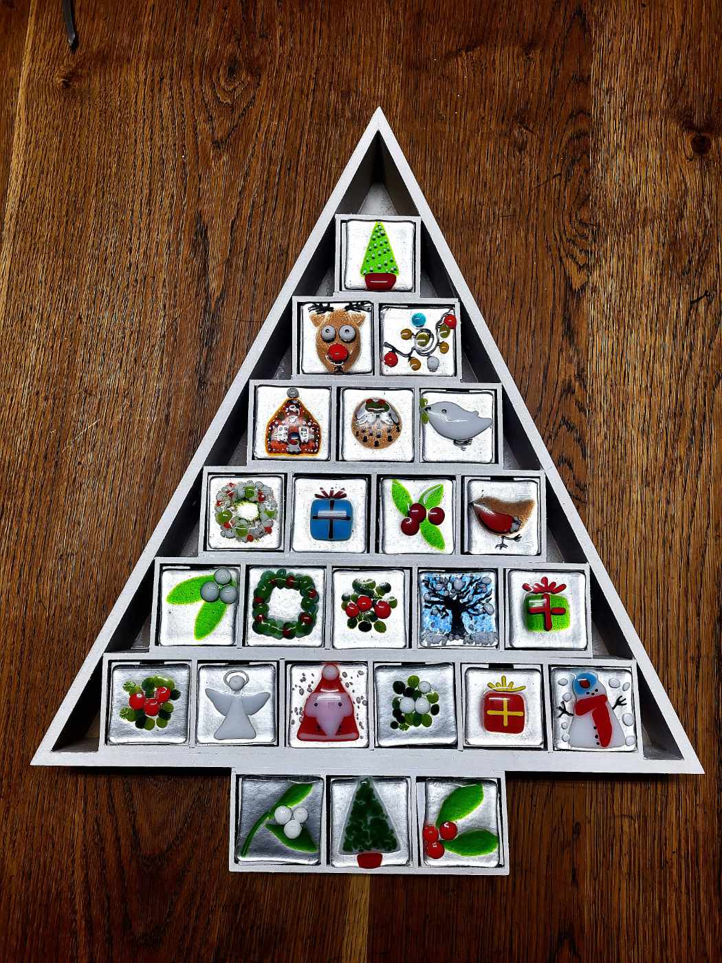 On this thoroughly festive course you will embellish 24 fusing glass squares with gorgeous Christmas imagery that can be personalised with names or numbers that are then all magiced in all their glory in to the kiln and ready to back and bond on to your wooden Christmas tree advent calendar blank that is included within your course fee.