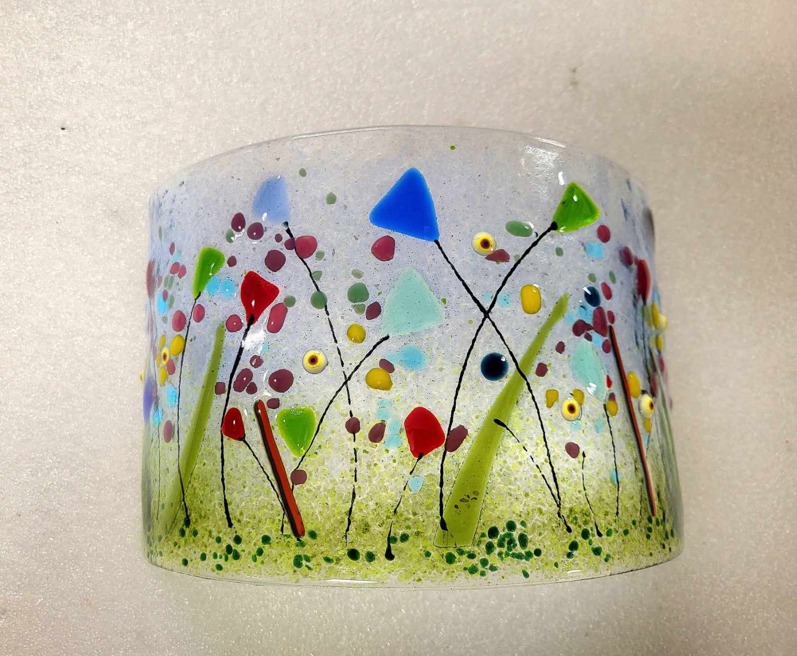Your finished piece will be slumped into a gentle curve, perfect for standing with a tea light behind it. The light catches the colours and details beautifully – it makes a lovely decorative piece for your home or a thoughtful handmade gift.
